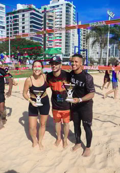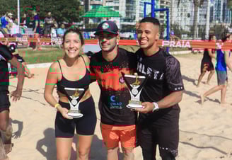 Katherine Cifali e Mateus Kleison recebendo o troféu de campeões do Misto Livre do Kelvin, dono do CT KS Futevôlei.